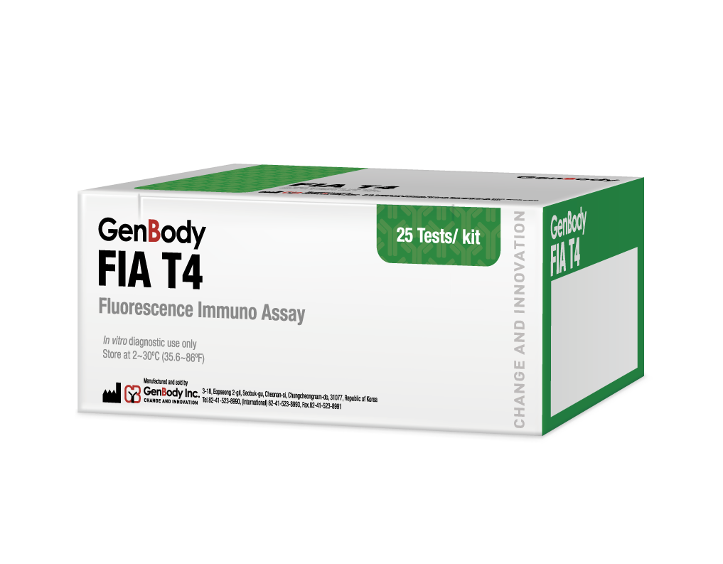 T4 (Thyroxine)는 갑상선이 생성하는 주요 호르몬 중의 하나이며 체내에 단백질 결합형 (티록신결합글로불린, 알부민 등과 결합형)과 자유형 (비결합형, free T4)으로 존재합니다. 갑상선이 T4를 충분히 생성하지 못하면, 체중증가, 피부건조, 추위 민감, 불규칙 월경 및 피로감과 같은 갑상선기능저하증의 증상이 생기게 되며, 갑상선이 과량의 T4를 생성하게 되면 체내 기능들의 속도가 증가하게 되어 심박수 증가, 불안, 체중감소, 불면, 손떨림 및 눈 주위가 붓는 등의 갑상선 기능 항진증 관련 증상이 발생하게 됩니다.