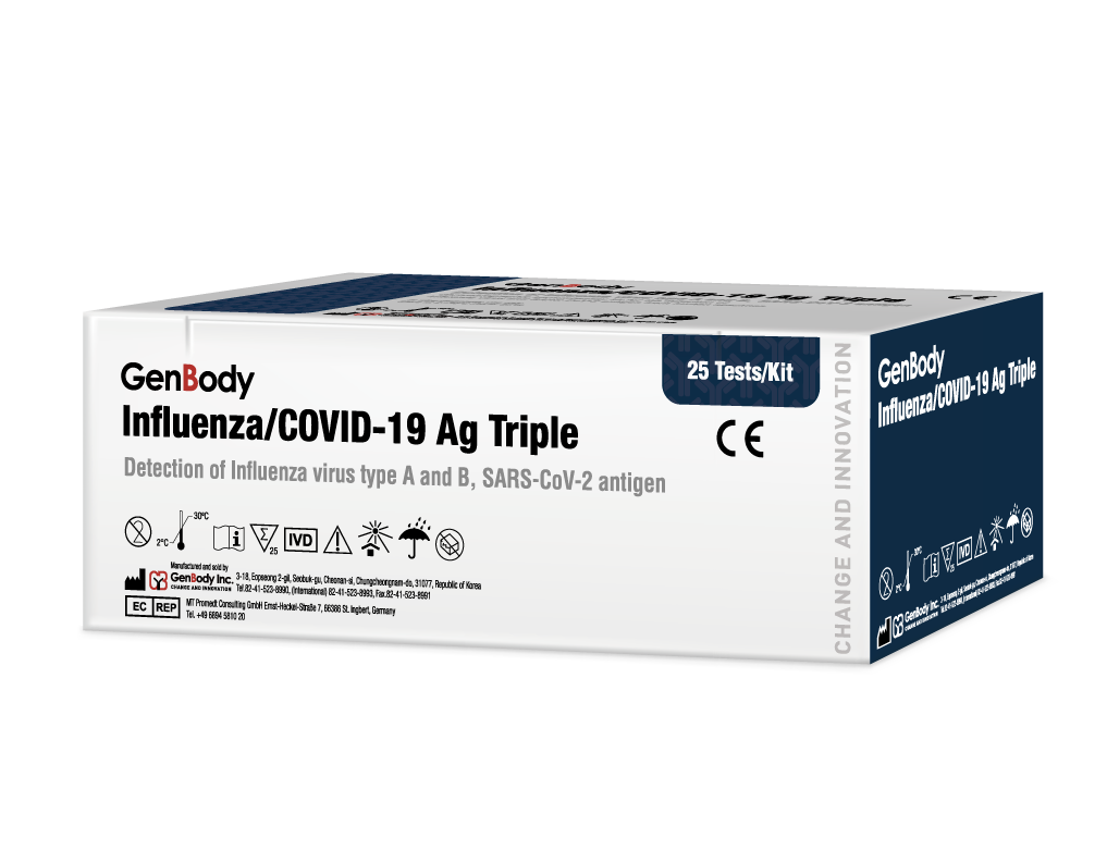 Influenza is an acute respiratory disease caused by a virus. Influenza is often divided into types A, B, and C, and influenza viruses found mostly in patients are type A or type B. GenBody Influenza A/B Ag is an in vitro diagnostic reagent that can quickly detect influenza A and B virus antigens present in human nasopharyngeal feces using immunochromatography. The measurement principle is that specific antibodies to influenza virus antigens are bound to gold particles, and specific antibodies to influenza virus antigens are bound to the test line of the membrane. Conjugates react first with influenza virus antigens collected from nasal pharyngeal secretions to form an antigen-antibody complex, which travels as it spreads to the membrane by capillary action. On the way, a secondary antigen-antibody reaction takes place with a specific antibody against the influenza virus antigen bound to the membrane in advance, indicating a visible red line to determine the result.