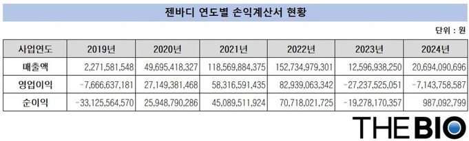 <젠바디 손익계산서 연도별 현황. 별도기준 (출처 : 더바이오 재구성)>